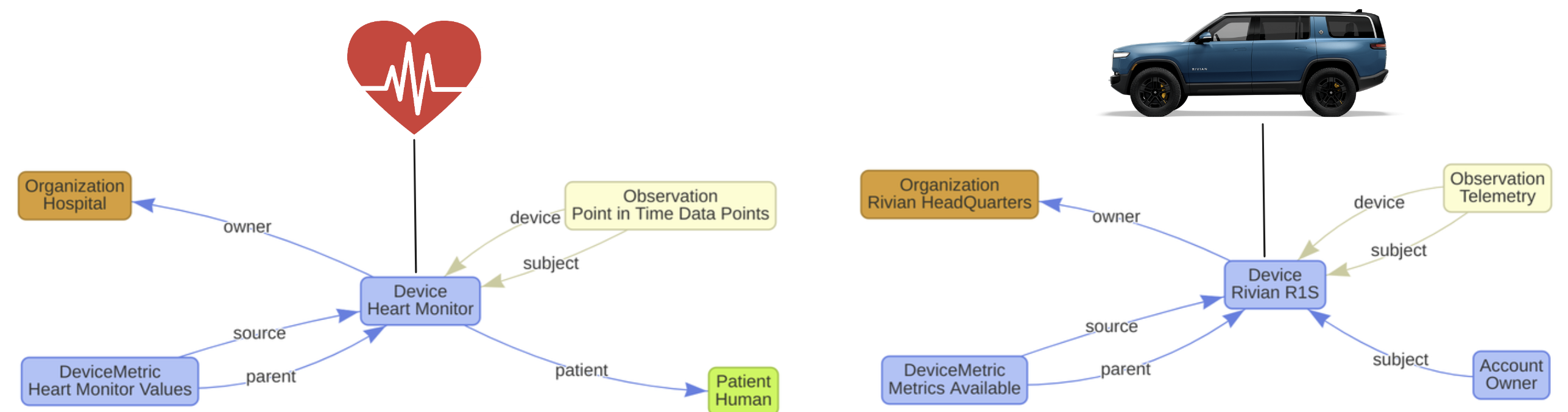 Using clinFHIR, lets visualize our FHIR Resources and the relationships between them to model our payloads for the workload. The model the left is a somewhat accurate way to onboard a device for Remote Monitoring in a hospital, on the right, is how we would onboard the Rivian. represented in FSH (FHIR Shorthand) and visualized by gb2.